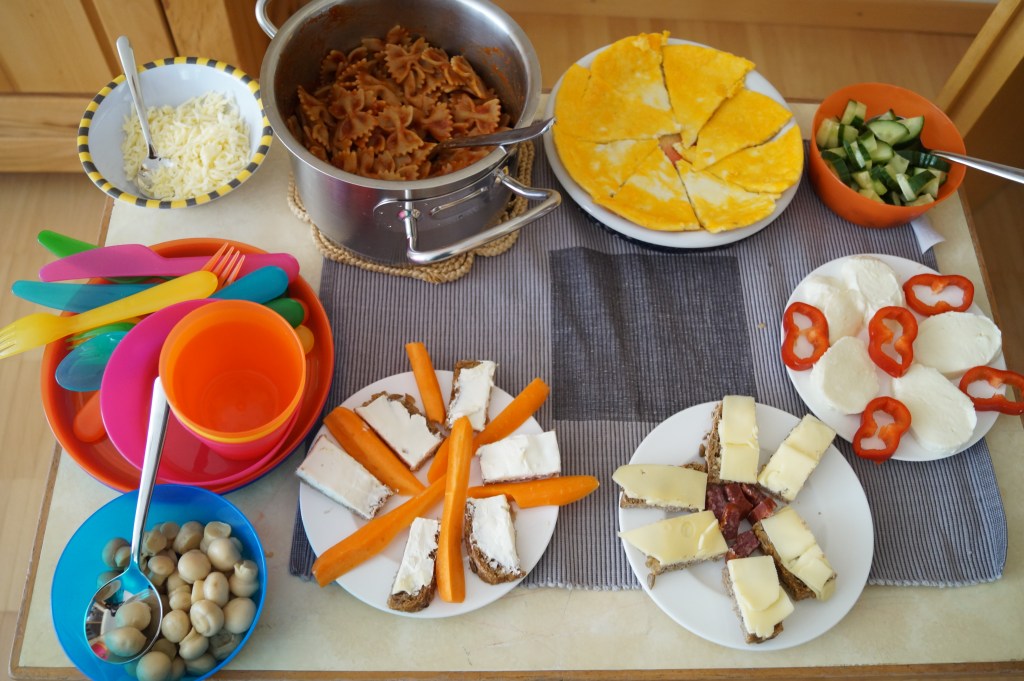 Beispielsweise habe ich noch eine Portion Reis und 2 Portionen Nudeln mit Tomatensoße übrig. Dann fülle ich das Buffet einfach mit allen möglichen Lebensmitteln auf, die ich noch in der Küche finde, wie zum Beispiel Gemüsesticks, Gurkensalat, Würstchen, Tomate-Mozzarella, Rührei, Käsewürfel, Sandwichtoast oder einfach normales Brot, das ich etwas schöner garniere.