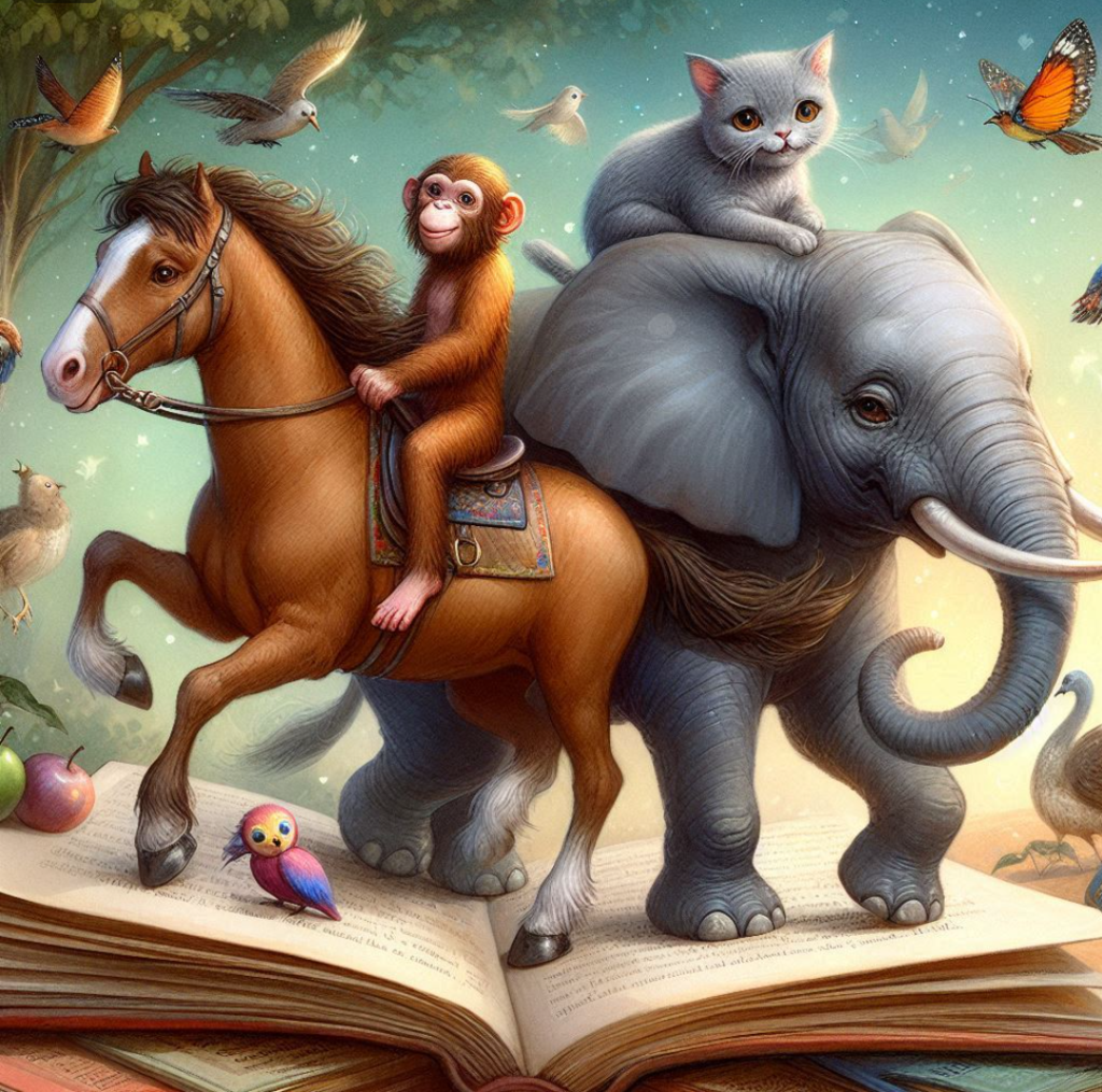 “Once upon a time, there was a big competition. With many children and animals. An elephant trumpeted. A horse galloped by. A monkey was sitting on the horse and doing tricks. A cat was riding on the elephant. And then the horse just fell over. And the elephant trampled over it. Then the elephant stumbled over its trunk. The horse got up again and ran away. The elephant rolled around a few times and rolled away. In the end, they all tumbled over the finish line. Then they fell asleep.”