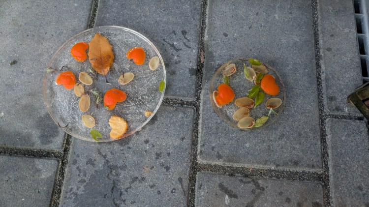 First, we used cookie cutters to cut hearts out of mandarin peels. Then, we gathered anything we could find for decoration, such as pistachio shells and leaves from the garden. We filled round plastic bowls and containers with some water (about 1 cm high) and distributed our decorations in them. We let the whole thing freeze overnight, creating ice discs. Using a straw, we blew a hole in the middle. Finally, we threaded ribbons through the holes and hung our ice pictures in the garden.
