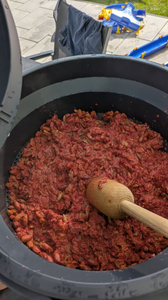 Due to time constraints, I froze the berries first. On a warm summer day, I set up my juicer on the terrace and loaded in the frozen fruit. It took quite a while before I saw any results. When I opened the pot, I was greeted by a milky liquid. That threw me off a bit, but I decided to ignore it and boiled the juice with gelling sugar. The finished jelly turned red again.