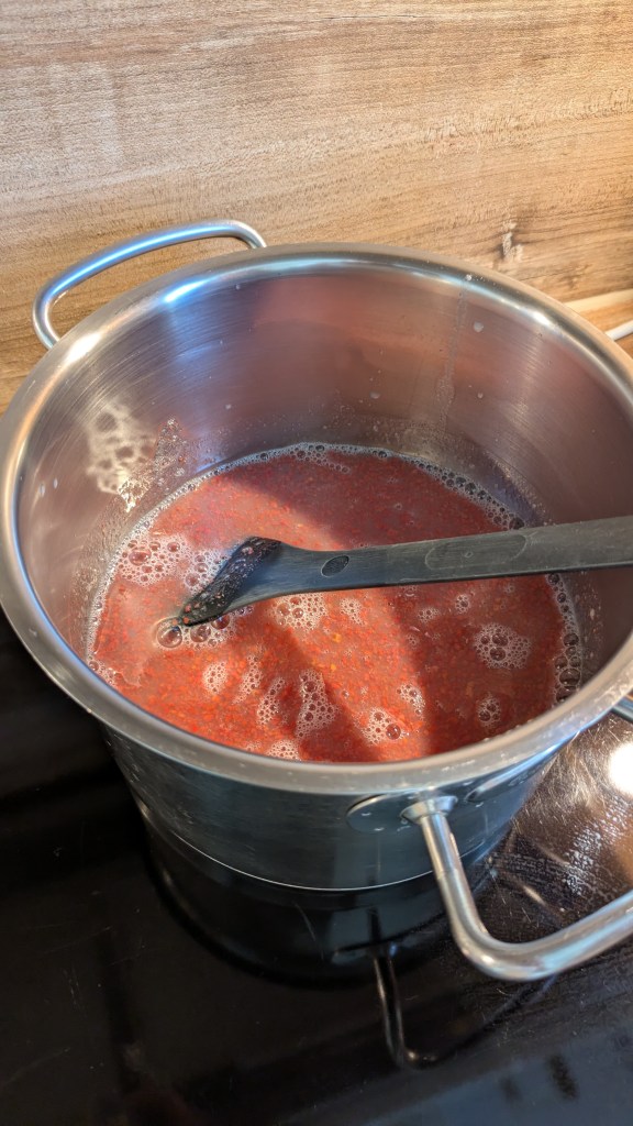 Aus Zeitgründen fror ich die Beeren erst einmal ein. An einem warmen Sommertag stellte ich dann meinen Entsafter auf die Terrasse und füllte die gefrorenen Beeren ein. Es dauerte eine ganze Weile, bis ich ein Ergebnis sehen konnte. Nach dem Öffnen des Topfes fand ich eine milchige Flüssigkeit vor. Das irritierte mich ziemlich, doch ich beschloss, es zu ignorieren, und kochte den Saft mit Gelierzucker auf. Das fertige Gelee war dann wieder rot.