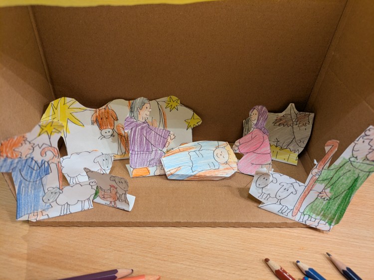 After the story, we did a craft. I wanted to make a stable with a manger with the children, something they could take home as a keepsake. I had prepared several shoeboxes and cut off one long side, which I then covered with crepe paper. On the “Christliche Perlen” page, I had found templates for the figures.https://christlicheperlen.wordpress.com/2012/08/28/bastelkrippe-zum-ausdrucken/The children could then colour and cut out the figures and glue them into the stable.
